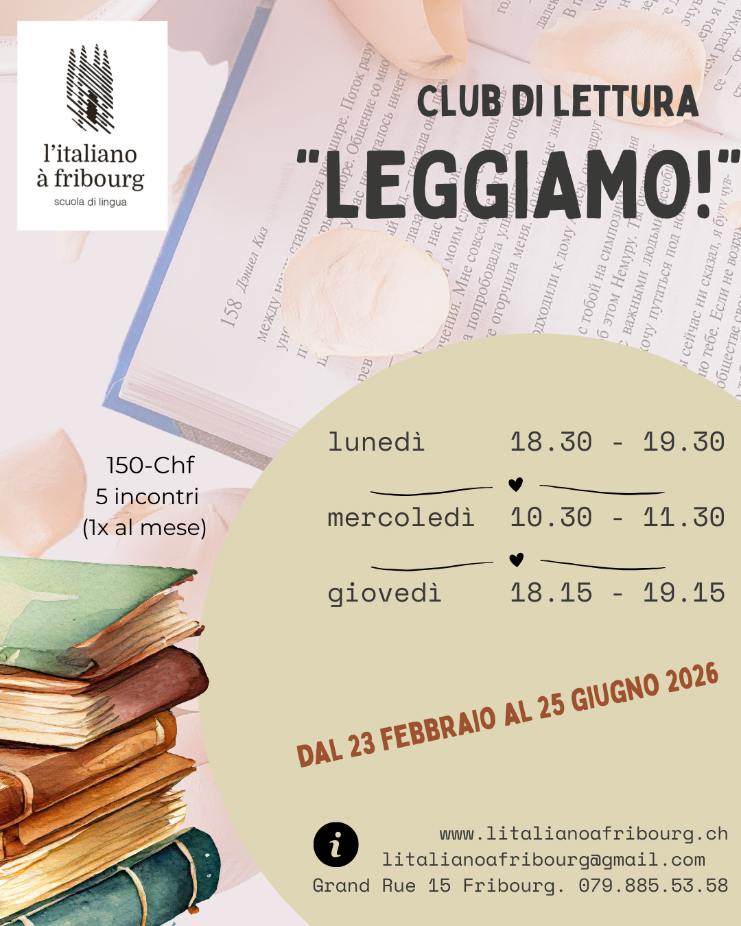 | giovedi dalle 18:15 alle 19:15 (1 volta al mese) | 150-Chf (5 incontri da 26 febbraio al 26 giugno '26) |